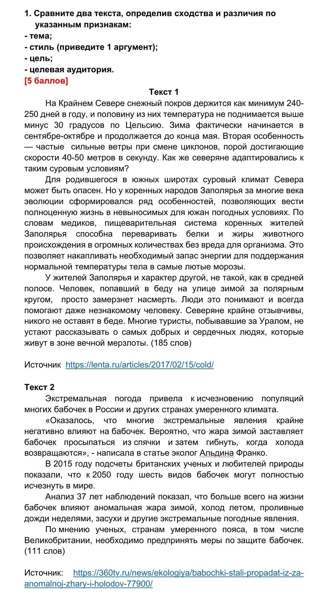 1. Сравните два текста, определив сходства и различия по указанным признакам: