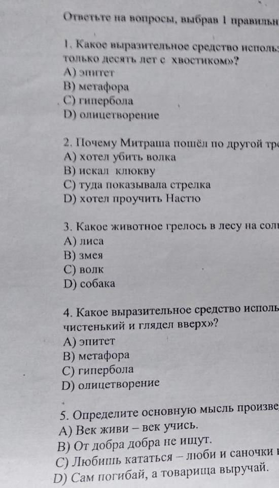 1. Какое выразительное средство использовано в описании Митраши: «Ему было всего только десять лет с хвостиком»? A) эпитет B) метафора ) гипербола D) oлицетворение 2. Почему Митраша пошёл по другой тропе? А) хотел убить волка B) искал клюкву C) туда показывала стрелка D) хотел проучить Настю 3. Какое животное грелось в лесу на солнце? А) лиса В) змея С) волк D) cобака 4. Какое выразительное средство использовано в описании Насти: «Только носик один был чистенький и глядел вверх»? А) эпитет B) метафора C) гипербола D) олицетворение 5. Определите основную мысль произведения Пришвина «Кладовая солнца». А) Век живи -век учись. В) От добра добра не ишут. С) Любишь кататься -Люби и саночки возить. D) Cам погибай, а товарища выручай.