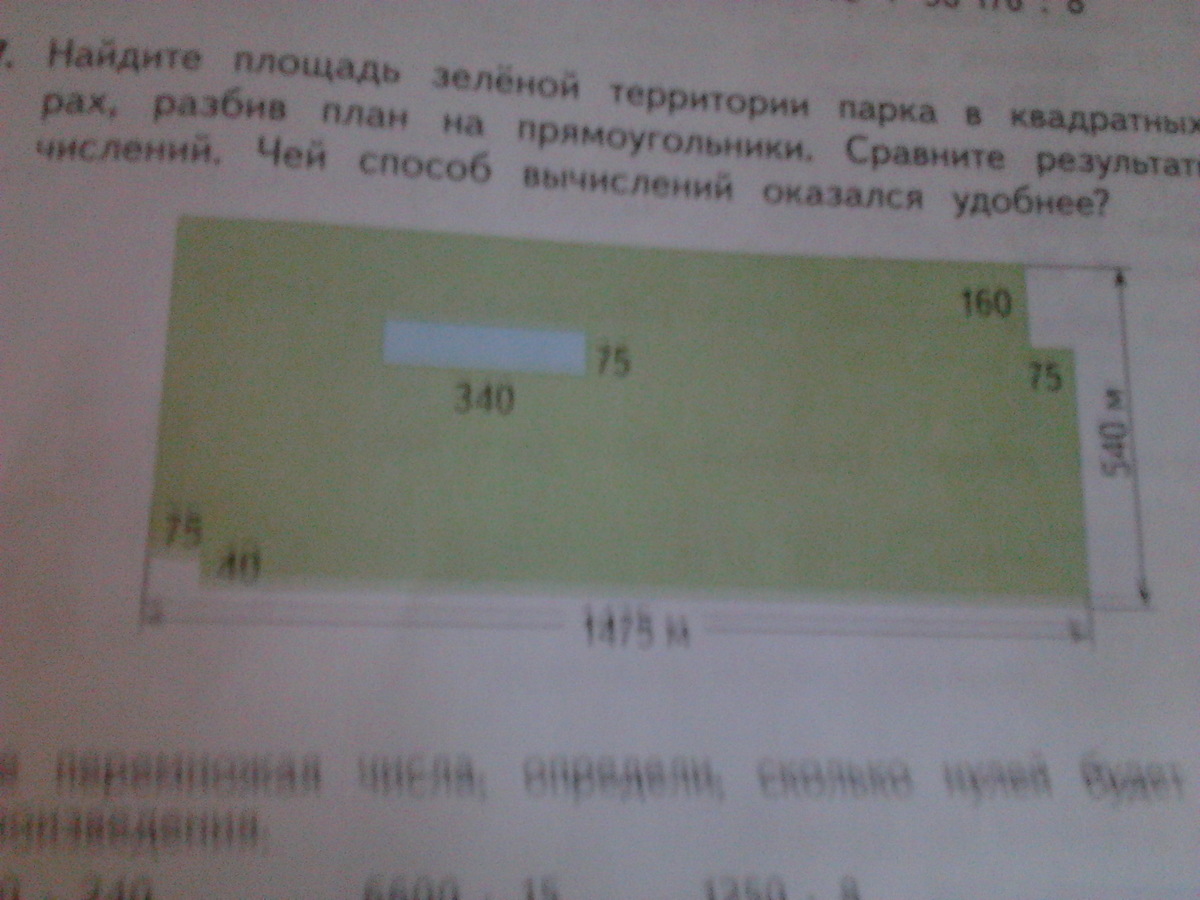 Найдите площадь зелёной территории парка в квадратных метрах , разбив план на прямоугольники.Сравните результаты числений. Чей способ удобнее?