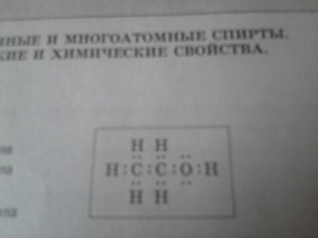 1.На рисунке изображена: а) структурная формула метанола; б) электронная формула метанола; в) электронная формула этанола; г) молекулярная формула метанола. 2.В молекулах спиртов водороднвые связи: а) образуются за счёт свободных электронных пар у атомов Гидрогена; б) образуютя за счёт свободных элктронных пар у атомов Оксигена; в) образуются за счёт притяжения углеводородных радикалов; г) обуславливают более высокие температуры кипения по сравнению с соответствующими углеводородами.
