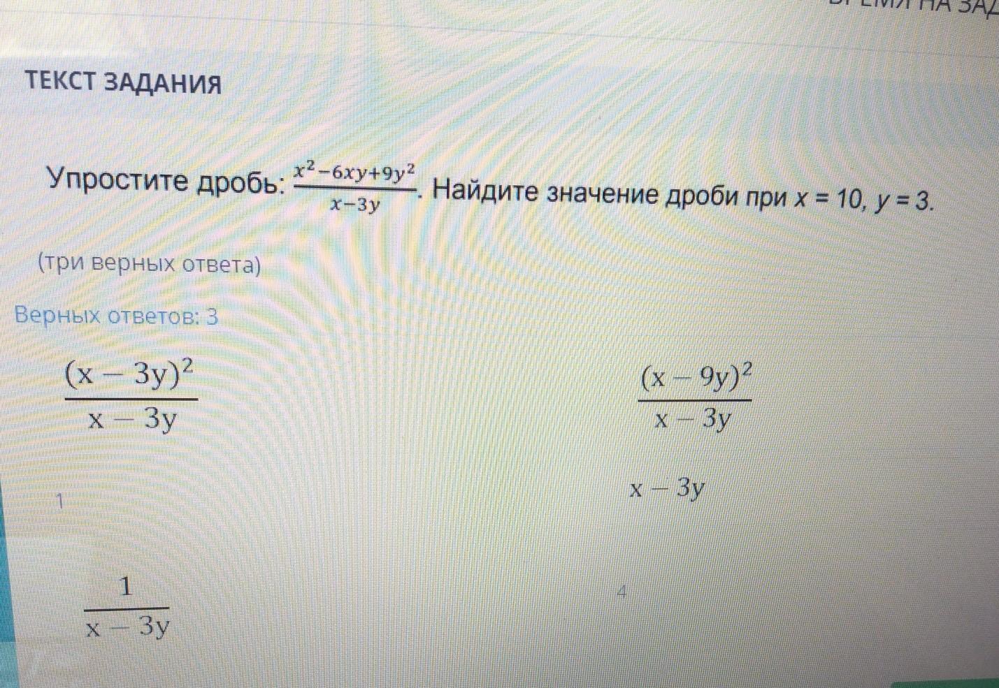 В числители это квадрат разности (х-3y)² в знаменателе х-3у , знаменатель полностью сокращается, а в числители только степень = х-3у. Подставляем значения = 10-3×3=10-9=1.