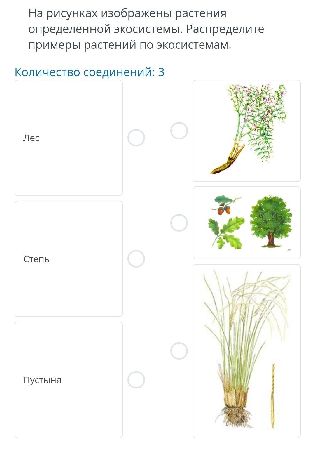 На рисунках изображены растения определённой экосистемы. Распределите примеры растений по экосистемам. Количество соединений: 3