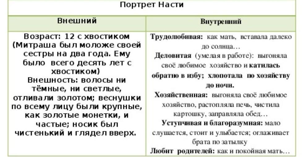 и создайте словесный портрет Насти. Заполните таблицу примерами