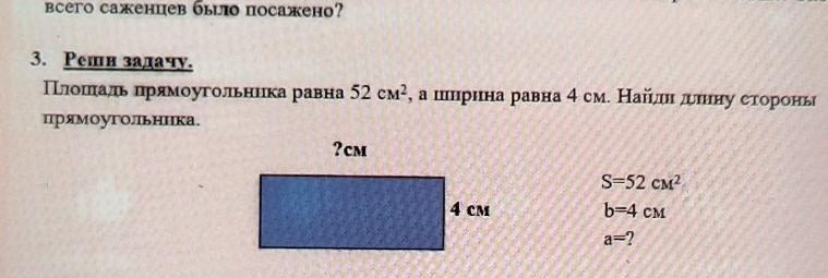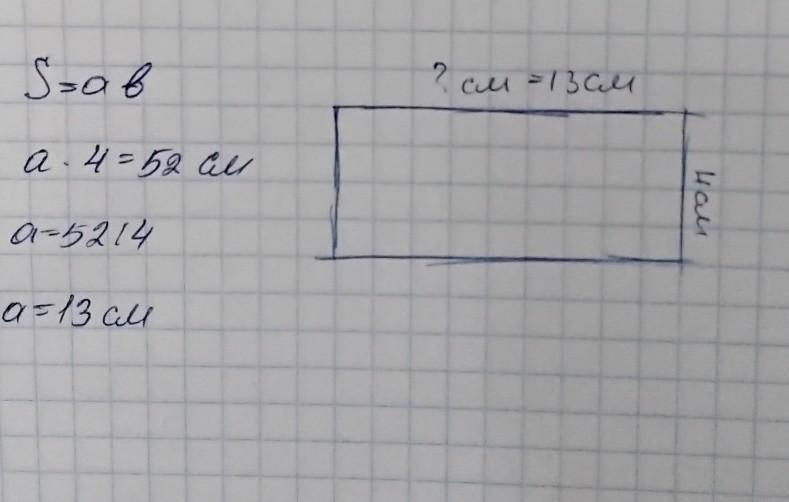 Площадь прямоугольника равна 52 см2, а ширина равна 4 см. Найди длину стороны