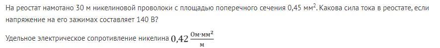 На реостат намотано 30 м никелиновой проволоки с площадью поперечного сечения 0,45 мм2. Какова сила тока в реостате, если напряжение на его зажимах составляет 140 В? Удельное электрическое сопротивление никелина (На фото)