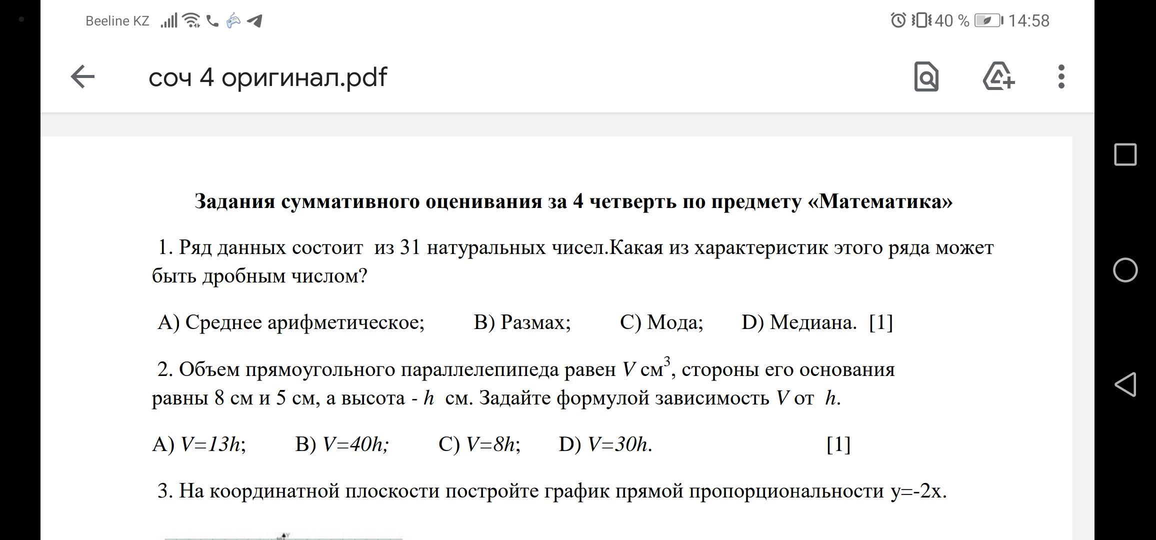 А) Среднее арифметическое; В) Размах; С) Мода; D) Медиана. [1]