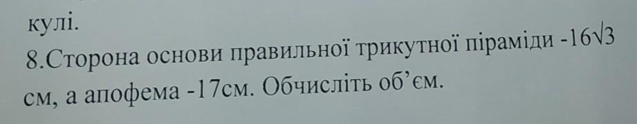 V = 1/3 · Sосн · H = 1/3 · 64√3 · 15 = 320√3 см³