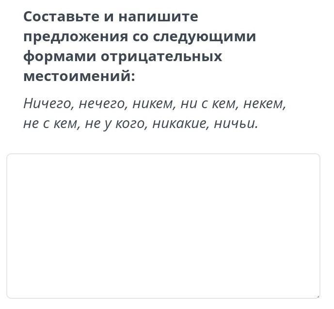 Ничего старшного. Нечего валяться весь день. Я никем не дорожу. Ни с кем не пойду. Мне некем вас заменить. Мне не с кем пойти. Не у кого нету этого? Никакие люди мне не помешают. Ничьи карандаши.