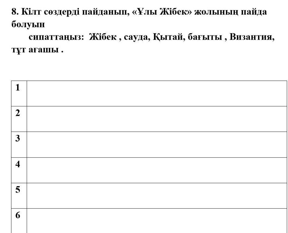 8. Кілт сөздерді пайданып , « Ұлы Жібек » жолының пайда болуын сипаттаңыз : Жібек , сауда , Қытай , бағыты , Византия , тұт ағашы . 1 2 3 4 5 5 6