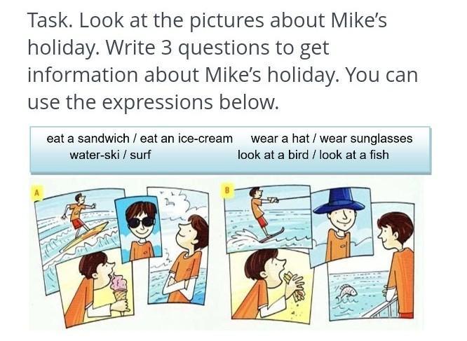 переведи и напиши эти предложения:1.какого цвета у майка на голове 2.что кушает майк на отдыхе.3.что делает майк на отдыхе