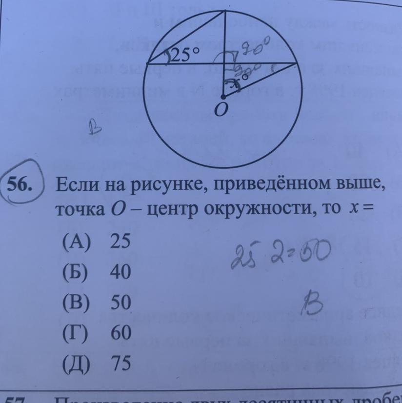 вписанный угол 25 измеряется половиной дуги, дуга=25*2=50