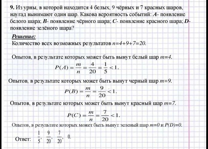Из урны, в которой находится 4 белых, 9 чёрных и 7 красных шаров, наугад вынимают два шара. Какова вероятность событий: А появление белого шара; В- появление чёрного шара; С- появление красного и белого шара ; D появление зелёного шара?