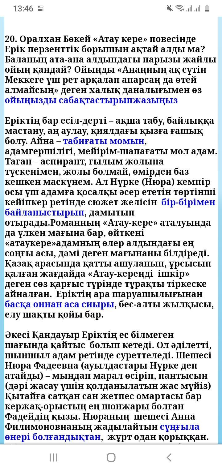 Оралхан Бөкей «Атау кере» повесінде Ерік перзенттік борышын ақтай алды ма? Баланың ата-ана алдындағы парызы жайлы ойың қандай? Ойыңды «Анаңның ақ сүтін Меккеге үш рет арқалап апарсаң да өтей алмайсың» деген халық даналығымен өз ойыңызды сабақтастырып жазыңыз.