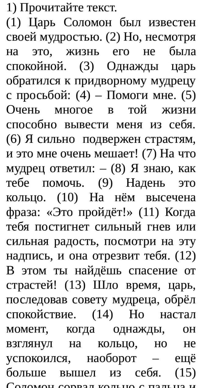 вот концовка. (15) Соломон сорвал кольцо с пальца и хотел зашвырнуть его подальше в пруд, как вдруг заметил, что и на внутренней стороне кольца имелась какая-то надпись. (16) Он присмотрелся и прочитал: «И это тоже пройдёт…»