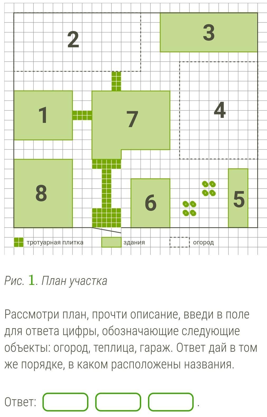 На рисунке — план домохозяйства, расположенного по адресу с. Ключевское, ул. Свердлова, д. 11. Въезд и выезд осуществляется через одни ворота. У входа устроена площадка с твёрдым покрытием, позволяющая легко выезжать с участка даже в распутицу. Слева располагается большой гараж, хозяин дома подрабатывает мелким авторемонтом. Следом за ним расположена банька, в которую можно пройти из дома по укреплённой дорожке. Также в дом легко занести зелень и овощи с грядок, расположенных на огороде, к которому можно подойти тоже по укреплённой плиткой дорожке. Эту часть посадок называют между собой огородом. Хозяйка разводит кур, для этого на участке тоже есть отдельное строение, планируется увеличивать поголовье, поэтому курятник и огороженная вокруг него территория — довольно большого размера. Семья зарабатывает, продавая выращенную на участке клубнику, которая растёт на грядках, к ним ещё не проложена дорожка. Эту часть посадок хозяйка называет «моя клубника». Справа от ворот расположен небольшой сарайчик, дальше за ним разбиты цветочные клумбы, и у забора устроена крытая стеклом теплица.