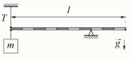 Невесомый рычаг длиной l=1 м закреплен на опоре (см. рисунок). К левому концу рычага подвешен груз массой m. В этой же точке к рычагу прикреплена вертикальная нерастяжимая нить. Ускорение свободного падения g=10 Н/кг.