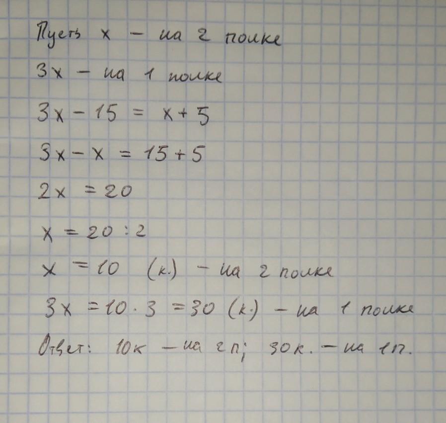 На 2 полках лежат книги. На 1 полке в 3 раза больше,чем на 2.Когда с 1 полки убрали 15 книг, а на 2 добавили 5 книг, то книг на полках стало поровну. Сколько книг было на каждой полке первоначально? ПОМОГИТЕ РЕШИТЬ ПОЖАЛУЙСТА ДАМ 40 БАЛЛОВ!