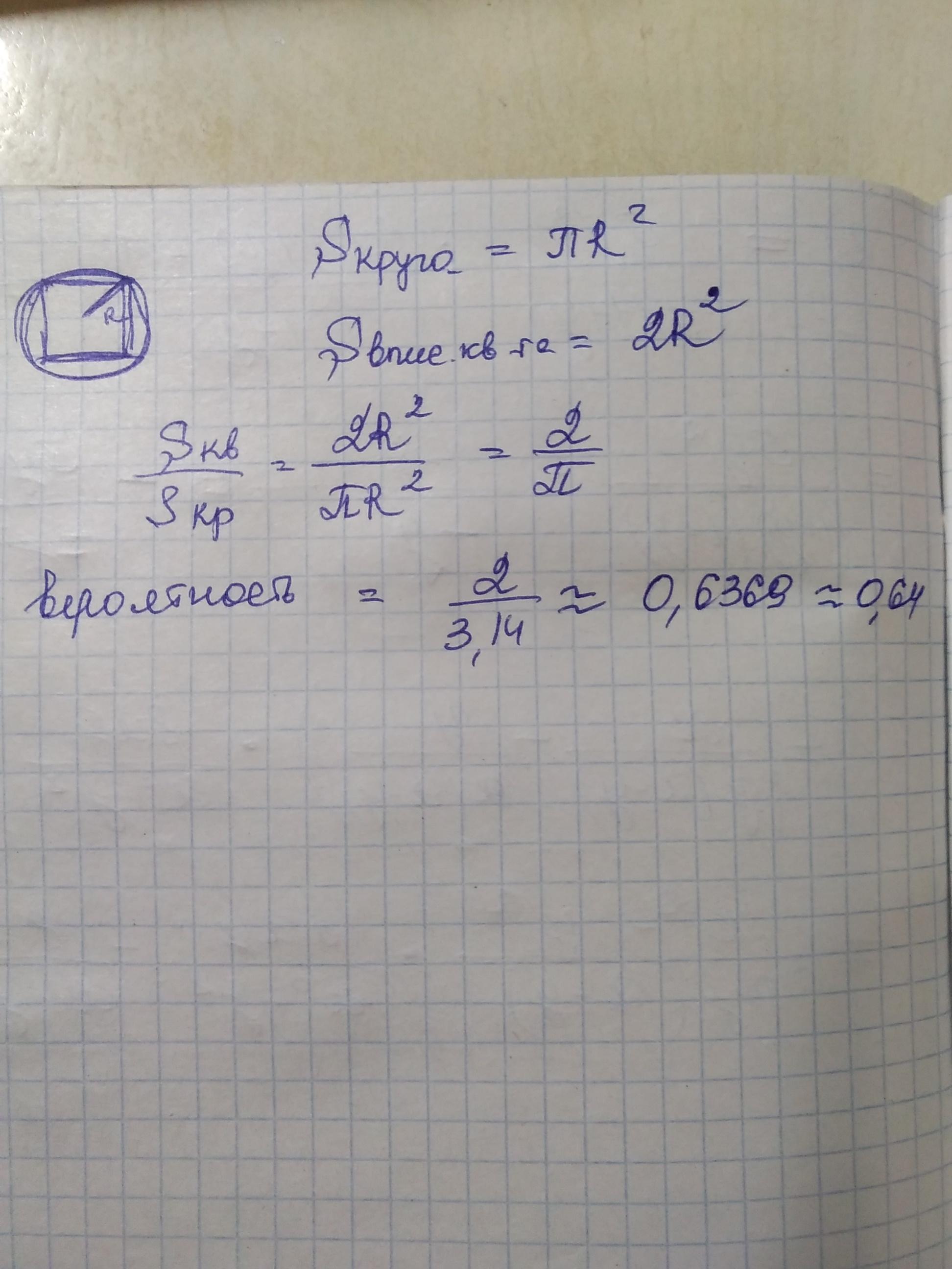 Внутрь круга диаметром R наудачу брошена точка. Найти вероятность того, что точка окажется внутри вписанного в круг квадрата. Предполагается, что вероятность падения точки в часть круга пропорциональна площади этой части и не зависит от ее расположения относительно круга.