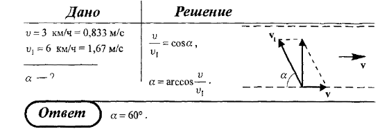 Скорость течения реки = 3км/ч, а скорость движения лодки относительно воды = 6 км/ч. Определить под каким углом относительно берега должна двигаться лодка чтобы проплыть поперек реки