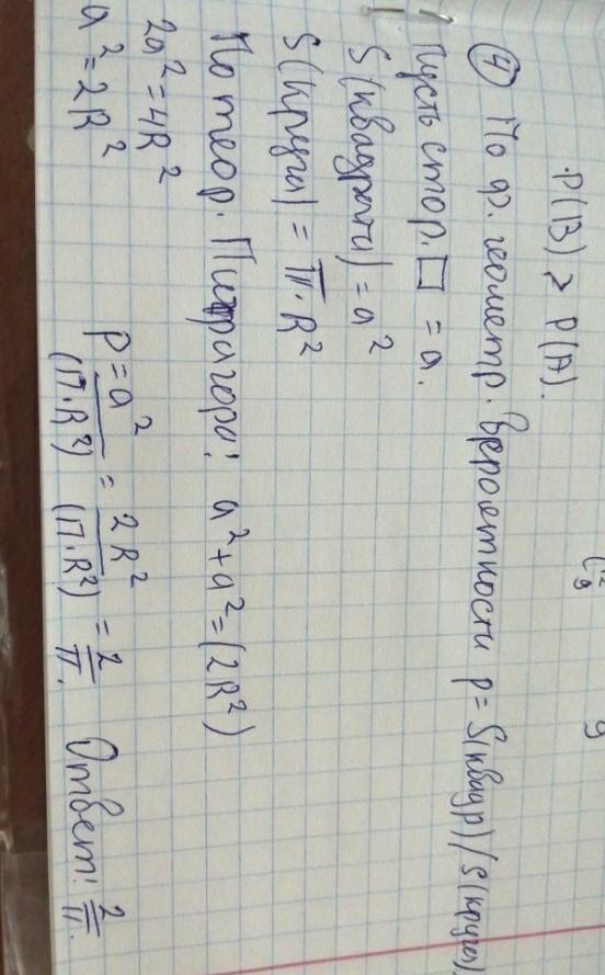 4. Внутрь круга радиуса R = 5 см наудачу брошена точка. Найти вероятность того, что точка окажется внутри вписанного в круг квадрата со стороной а = 2 см. Предполагается, что вероятность падения точки в часть круга пропорциональна площади этой части и не зависит от ее расположения относительно круга.