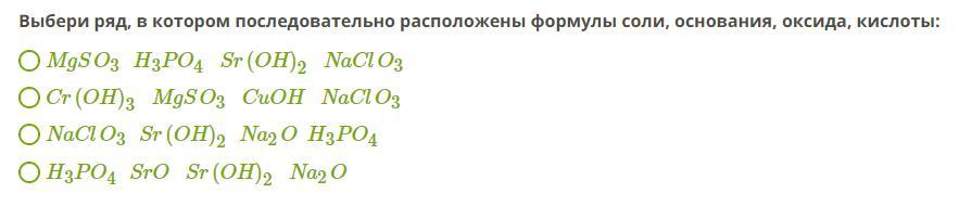 Выбери ряд, в котором последовательно расположены формулы соли, основания, оксида, кислоты: