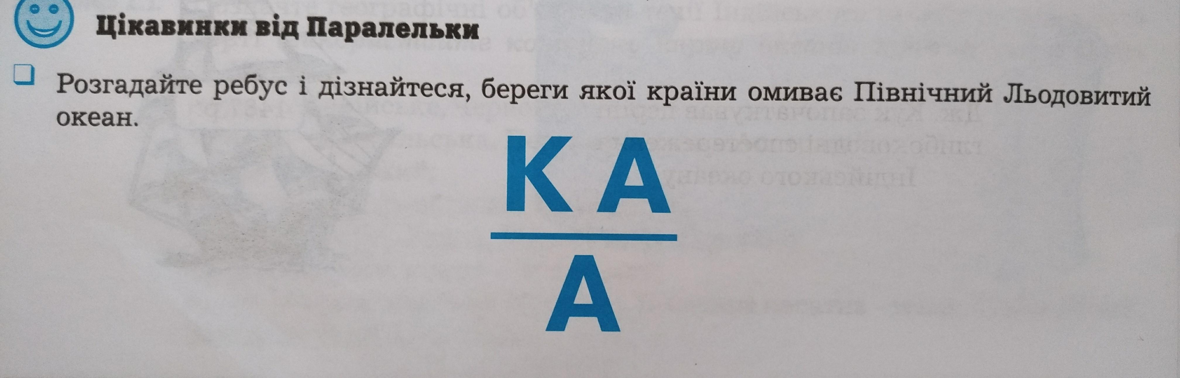 Розгадайте ребус і дізнайтеся , береги якої країни омиває Північний Льодовитий океан.