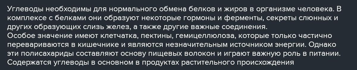 Энергетическую функцию несут прежде всего глюкоза, фруктоза, сахароза, а также крахмал и гликоген. Так называемые неперевариваемые углеводы - целлюлоза, гемицеллюлоза, пектиновые вещества также играют очень важную роль в питании. Пищевые волокна стимулируют перистальтику желудочно-кишечного тракта, адсорбируют токсические вещества и холестерин, обеспечивают оптимальные условия для жизнедеятельности нормальной микрофлоры кишечника.
