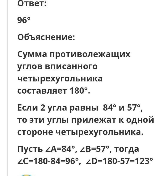 Два угла вписанного в окружность четырехугольника равны 47° и 84°. Найдите больший из оставшихся углов. В ответ запишите только число.
