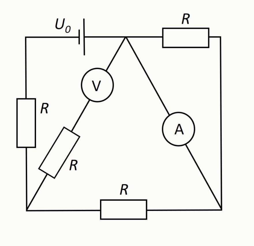 Цепь состоит из идеального источника с напряжением U0=4 В и четырех одинаковых резисторов сопротивлением R=2 Ом. Приборы идеальные. Написать показания амперметра и вольтметра