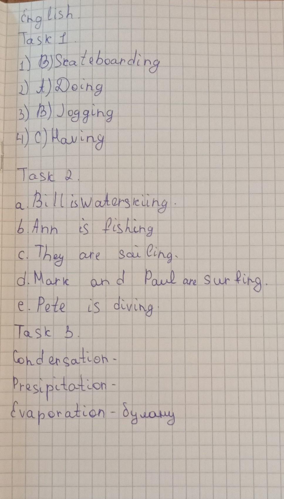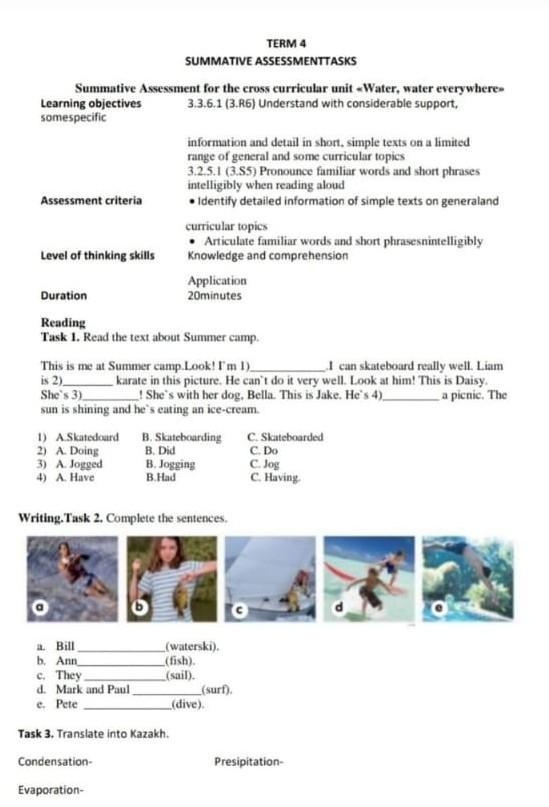Tusk 1. Read the text about Summer This is me at Summer camp.Look! I'm 1) is 2) She's 3) sun is shining and he's cating an ice-cream. I can skatebourd really well. Liam karate in this picture. He can't do it very well. Look at him! This is Daisy. a picnic. The She's with ber dog. Bella. This is Jake. He's 4) 1) ASkatedoard 2) A. Doing 3) A. Jogged 4) A. Have B. Skatebourding B. Did B. Jogging B.Had C. Skateboarded C. Do C. Jog C Having Writing. Task 2. Complete the sentences. a. Bill b. Ann c. They d. Mark and Paul e. Pete (waterski). (fish). (sail). (surf). (dive). Task 3. Translate into Kazakh. Condensation- Presipitation- Evaporation-