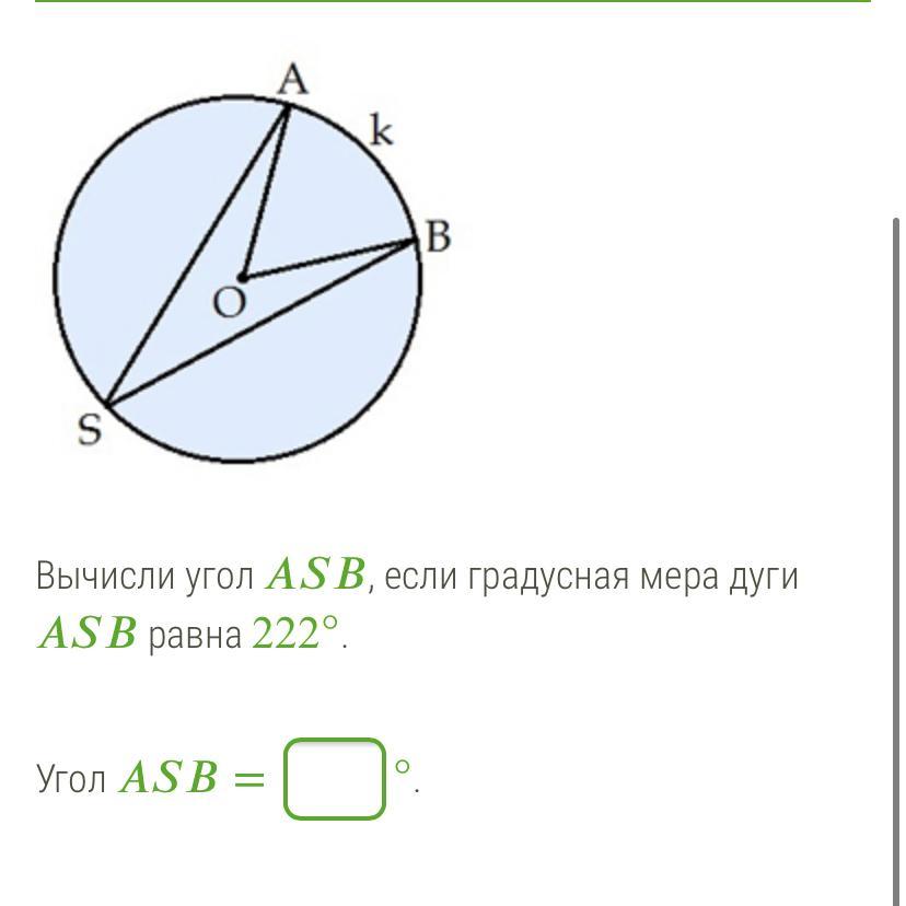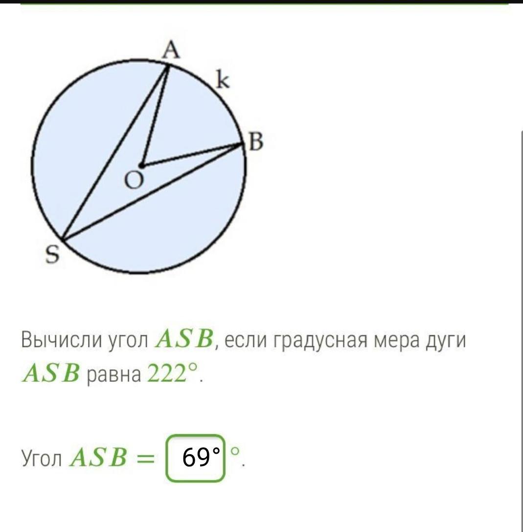 <АSB=<AOB/2=138°/2=69° вписанный угол равен половине центрального угла.