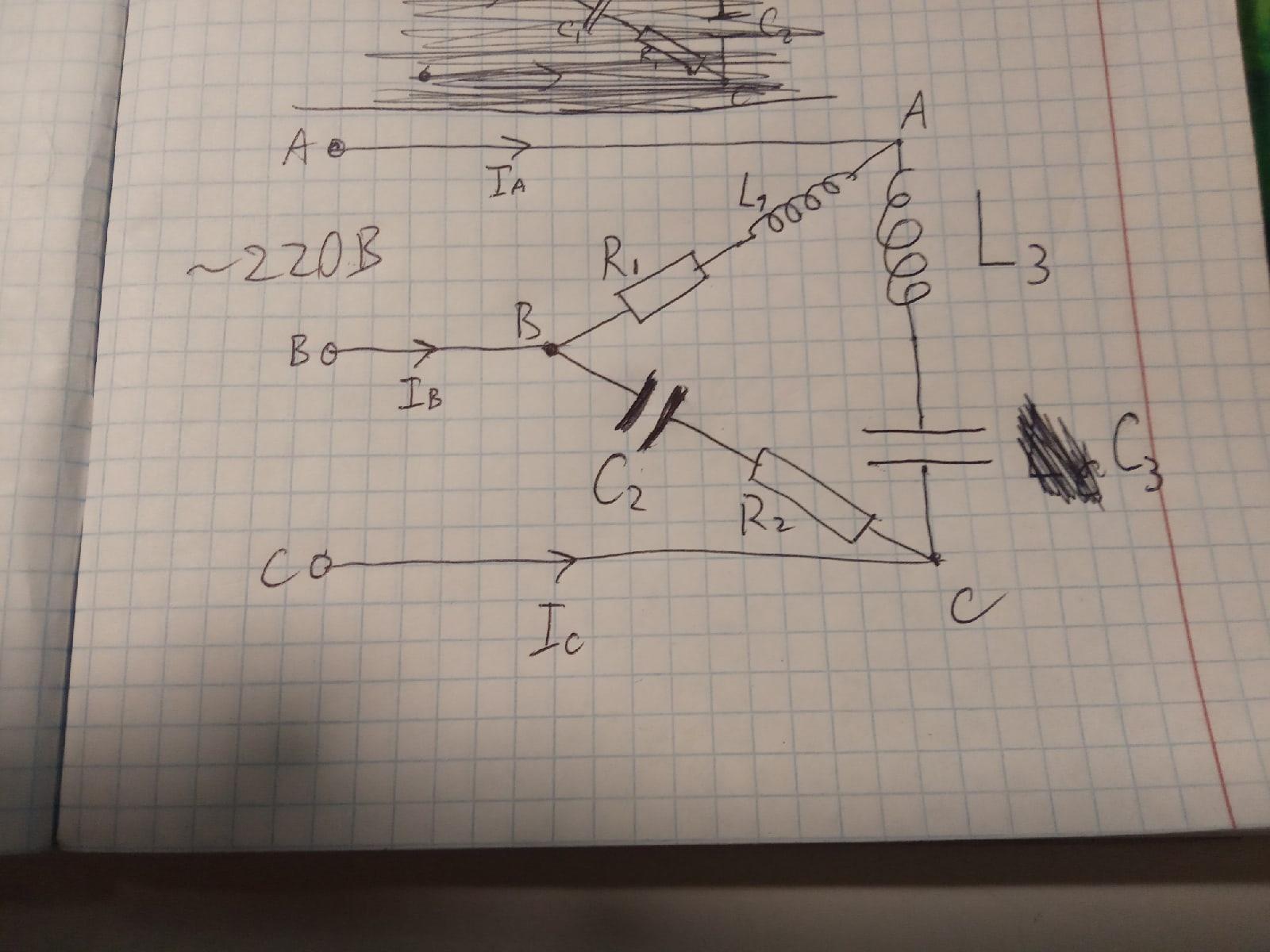 Найти трехфазные токи и напряжения между точками А, В, С на указанной схеме.