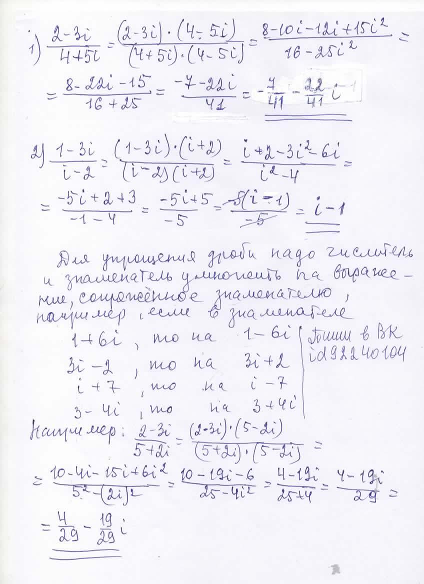 (2-3i)/(4+5i) × (4-5і)/(4-5і) = ((8+15)+(-10-12)і)/(16+25) =
