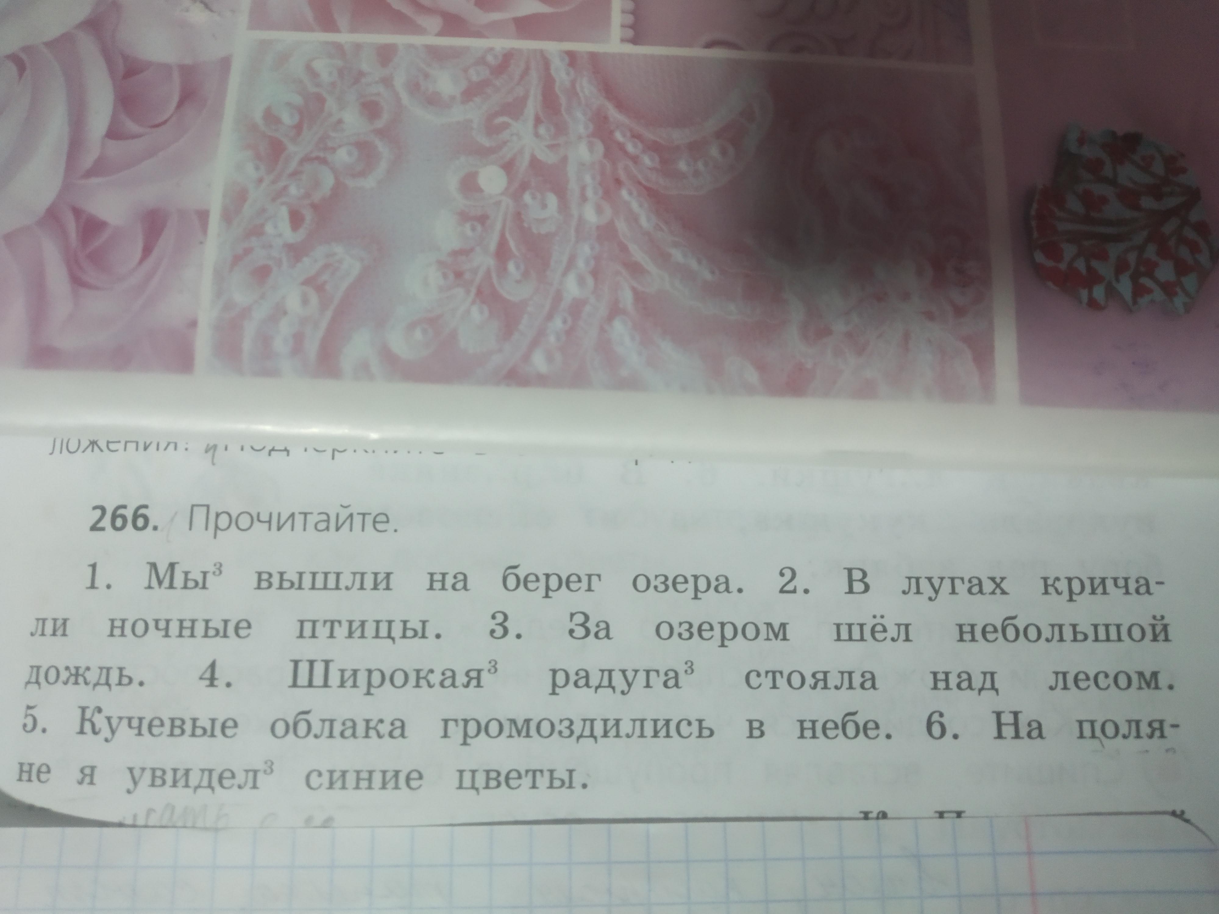 1. Мы(п) вышли(с)2. Кричали птицы 3. Шёл дождь 4. Радуга стояла 5. Облака громоздились 6. Я увидел