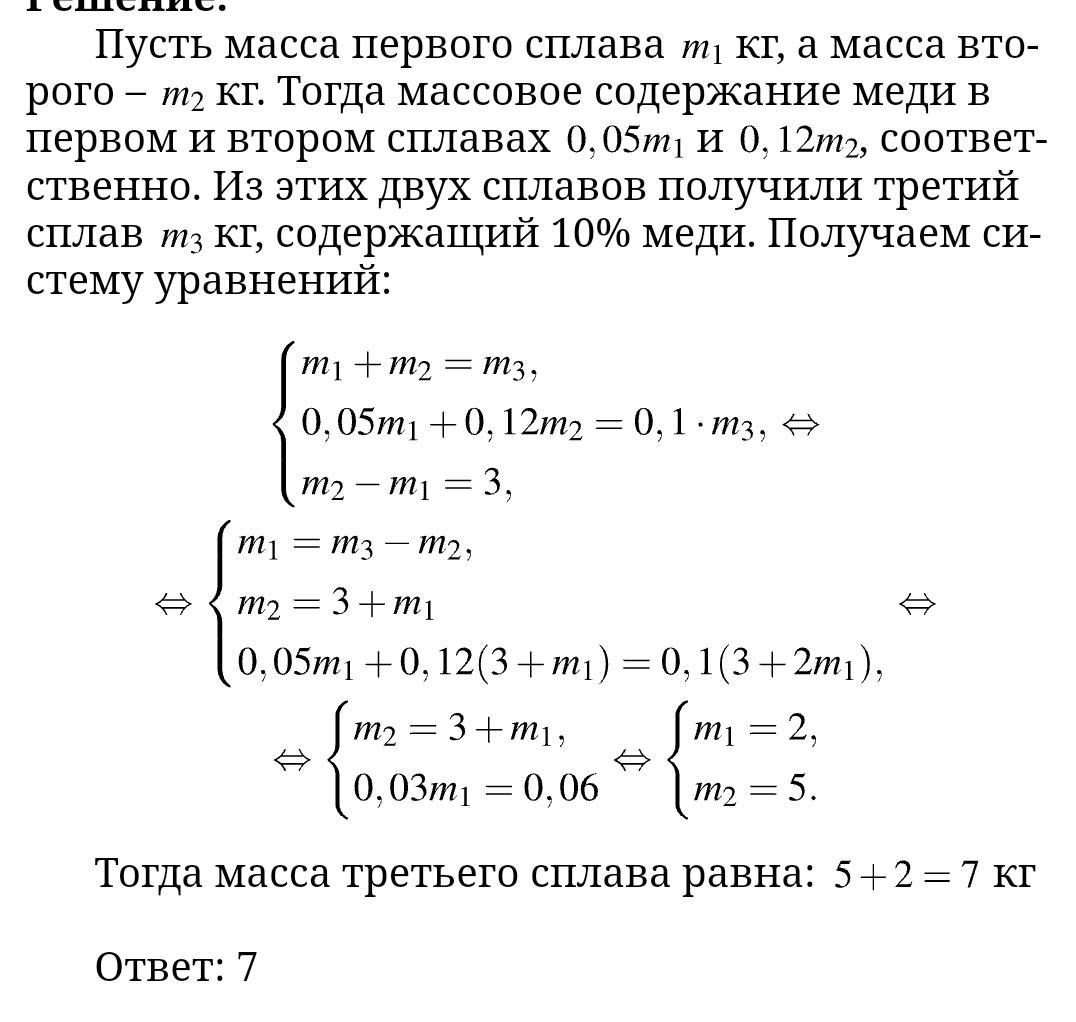 Имеется два сплава. Первый сплав содержит 5% меди, второй 12% меди. Масса второго сплава больше массы первого на 3 кг. Из этих двух сплавов получили третий сплав, содержащий 10% меди. Найдите массу третьего сплава. Ответ дайте в килограммах.