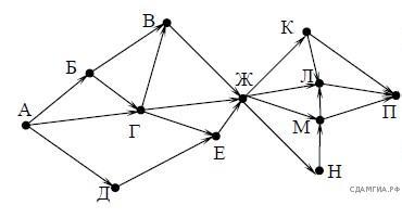 а рисунке — схема дорог, связывающих города А, Б, В, Г, Д, Е, Ж, К, Л, М, Н, П. По каждой дороге можно двигаться только в одном направлении, указанном стрелкой.