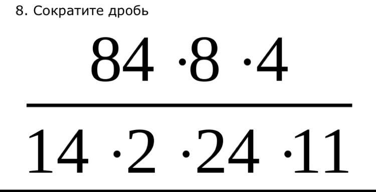 84 делится на 3 и на 4, значит делится на 12. Сократим 84 и 24 будет 7 и 2. (7*8*4)/(14*2*2*11). 14 и 7, 4 и (2*2) сокращаются. Будет 4/11