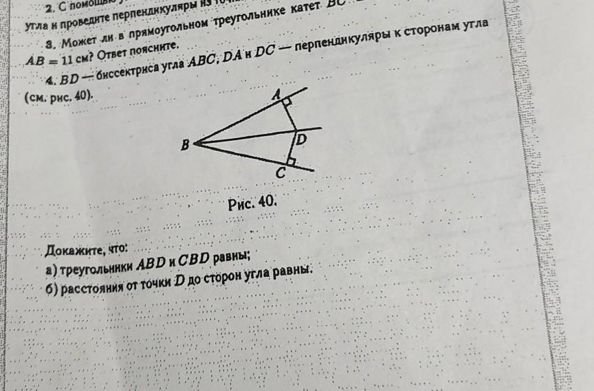 б) Из прошлого доказательства равенства треугольников следует, что соответственные элементы треугольников равны. Расстояние от точки до прямой это перпендикуляр. Значит расстояния до сторон угла равны AD и CD соответственно, а т.к. уже доказано, что ΔABD = ΔCBD, то AD = CD как соответственные элементы. ЧТД