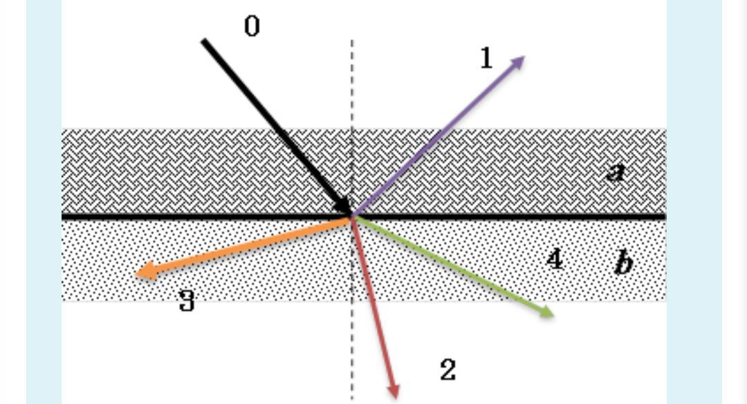 Якщо світло переходить з більш оптично густого середовища a в менш густе b, то який з наведених променів буде відповідати заломленому променю для падаючого променя 0