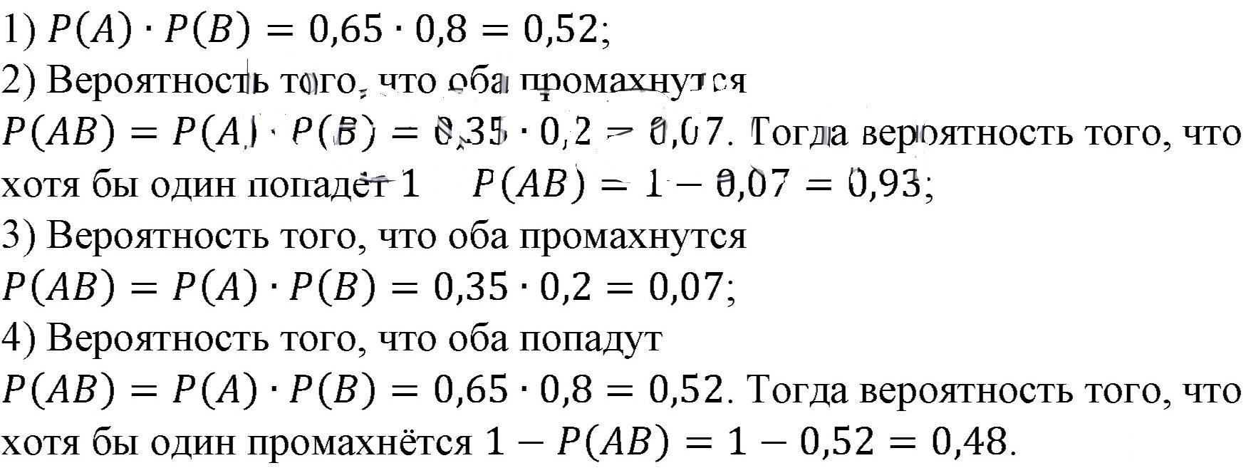Два стрелка производят один выстрел в цель. Первый попадает с вероятностью 0,65, а второй - 0,45. Найдите вероятность того, что в цель попал хотя бы один выстрел.