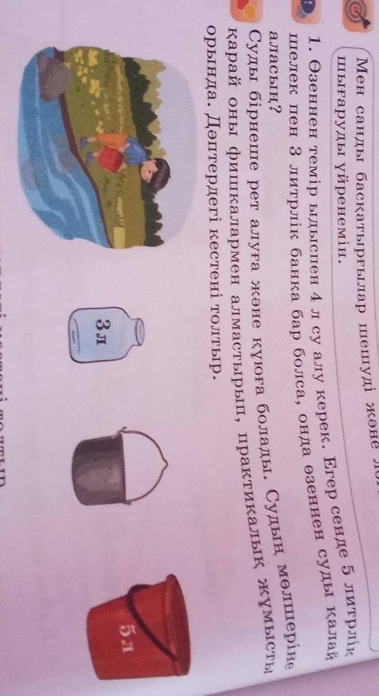 5литрлік шелекпен суды өзеннен аламыз,оны 3л.банкаға құямыз.Шелекте қалған 2литр суды темір ыдысқа құйып қоямыз.Тағыда 5литр су аламыз,манағы 3литрлік банкадағы суды төгіп тастаймыз да банкаға шелектегі судың 3литрін құямыз.Шелектегі қалған 2литр суды темір ыдысқа тағы құямыз сонда 4литр су болады.