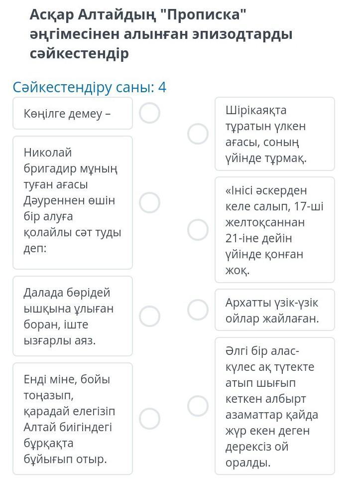 асқар алтайдың прописка әңгімесінен алынған эпизоттарды сәйкастендіріңіз
