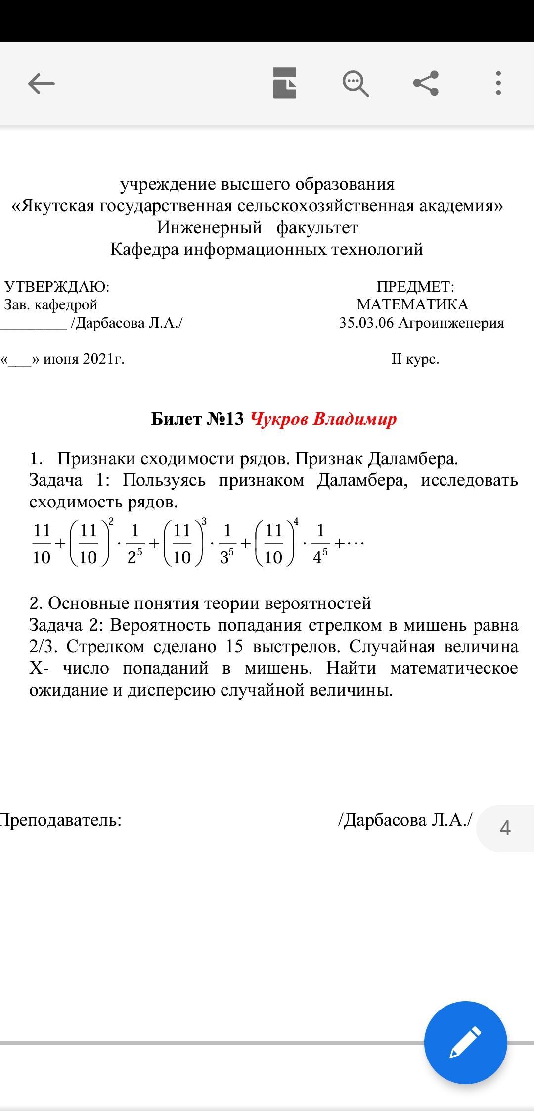1.Пользуясь признаком даламбера, иследовать сходимость рядов