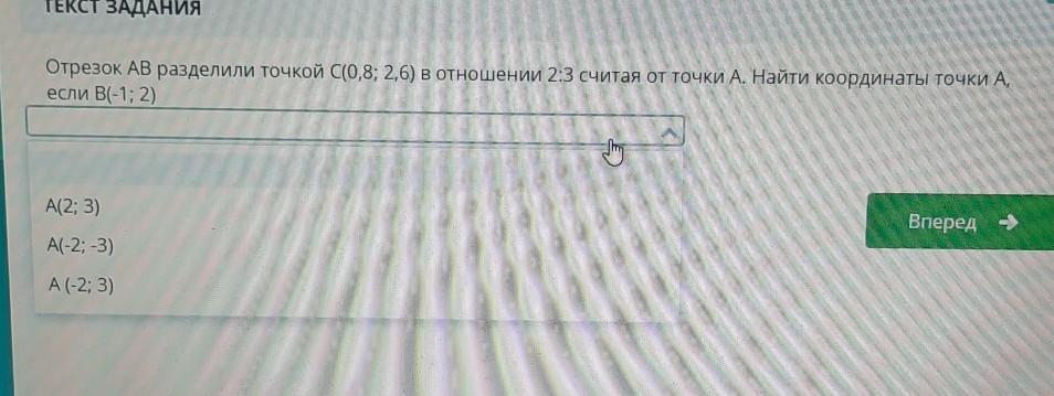 отрезок AB разделили точкой C 0,8 2,6 в отношении 2 и 3 считая от точки A найдите координаты точки А если B -1, 2 СРООЧНОО ТАМ ВЫБЕРИТЕ ПРАВИЛЬНЫЙ ВАРИАНТ