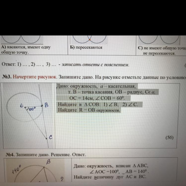 Угол В =90° так как касательная перпендикулярна радиусу. Сумма острых углов в прямоугольном треугольнике 90° , то угол С = 90-60=30°. ОВ=1/2ОС=1/2*14=7см. Так как ОВ лежит напротив угла 30°, а это значит что он равен половине гипатинузы.