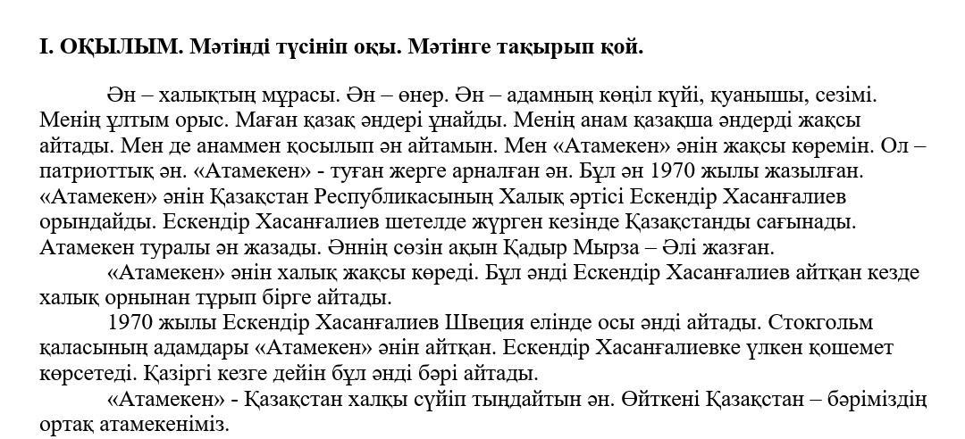 I. ОҚЫЛЫМ. Мәтінді түсініп оқы. Мәтінге тақырып қой.