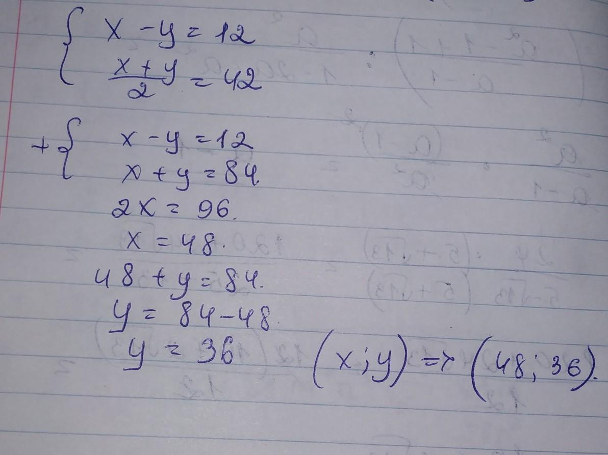 6. разность двух чисел равна 12, а среднее арифметическое равно 42. Составьте систему уравнений и найдите эти числа.