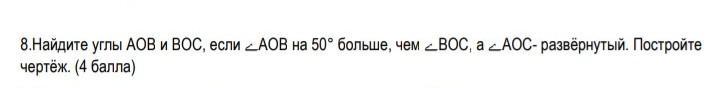 Найдите углы АОВ и ВОС,если<АОВ на 50° больше, чем < ВОС,а <АОС -развёрнутый. Постройте чертёж.