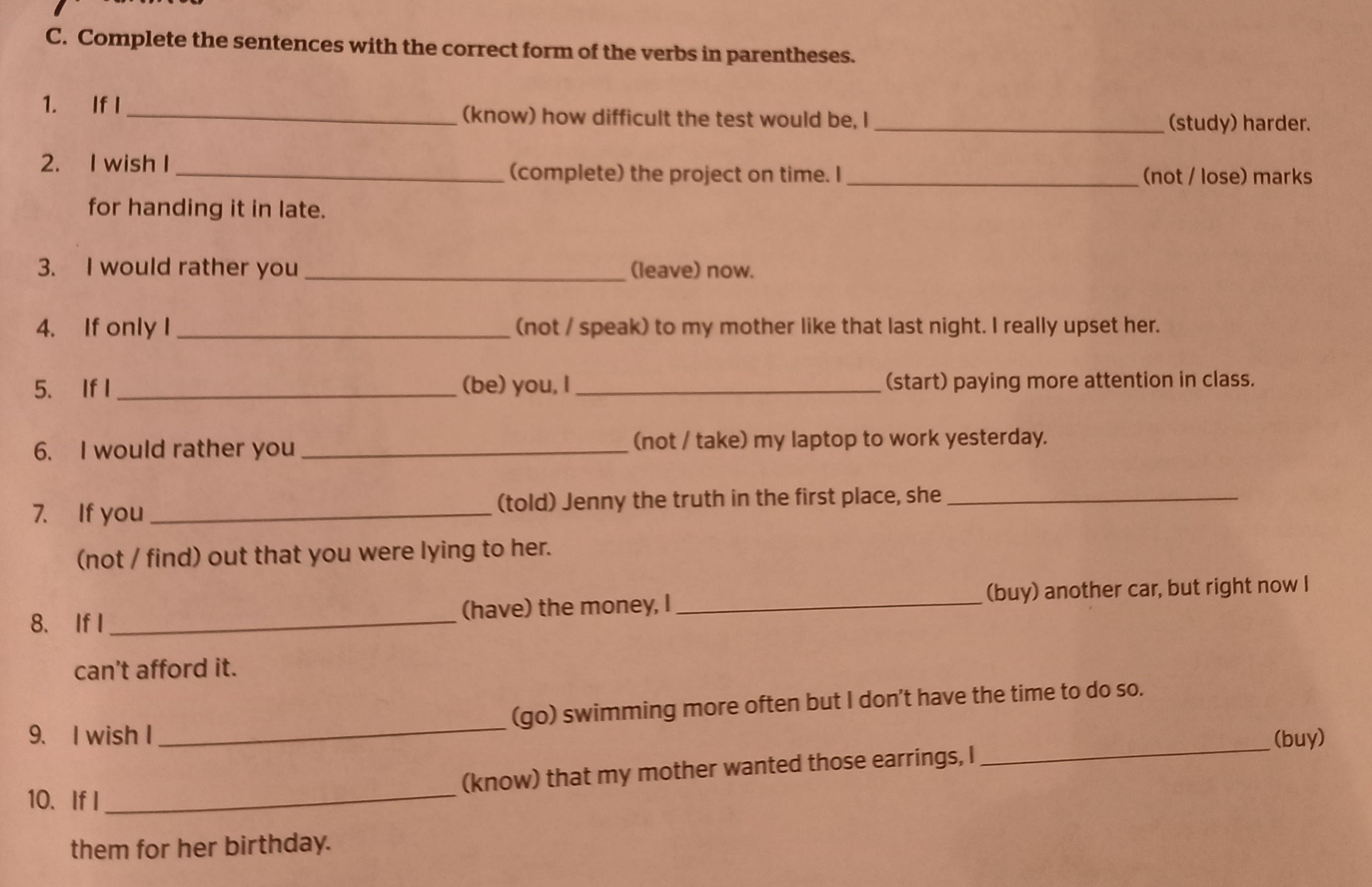 1 had known... would have studied 2 had completed... wouldn't have lost 3 left 4 hadn't spoken 5 were... would start 6 hadn't taken 7 had told.. wouldn't have found 8 had... would buy 9went 10 had known... would have bought