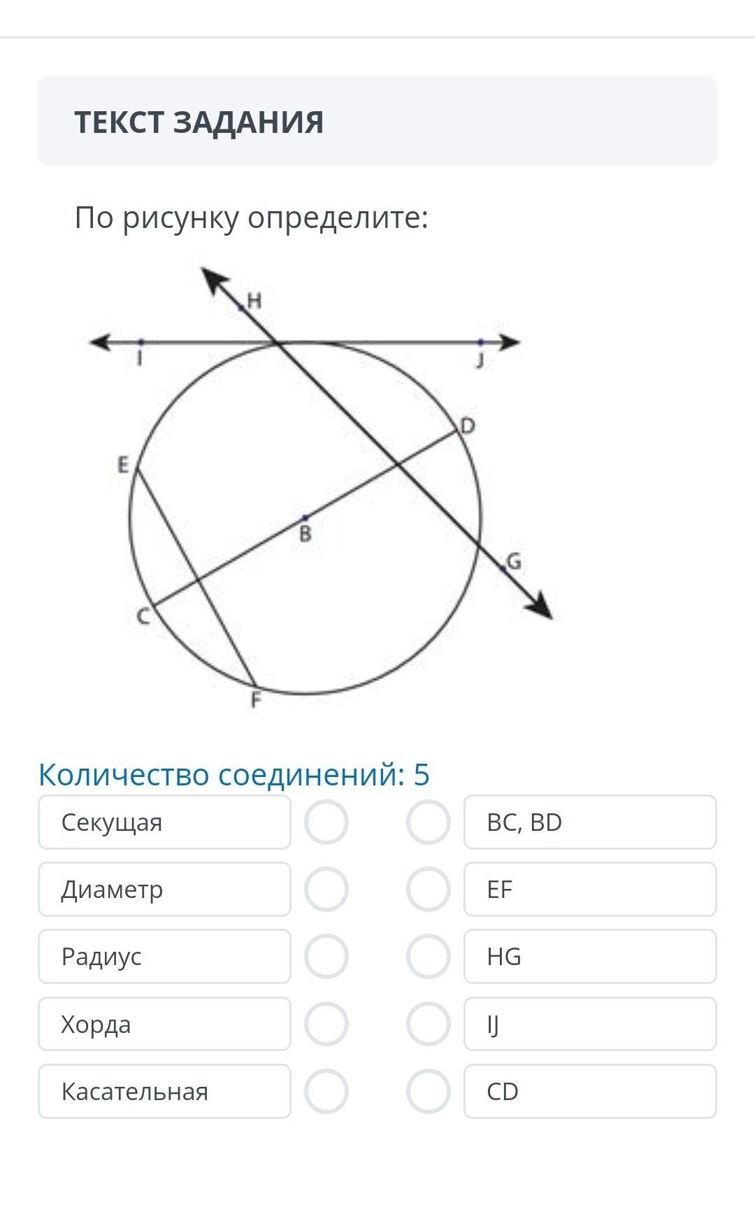 Секущая-HG Диаметр-CD Радиус-BC,BD Хорда-EF касательная-IJ